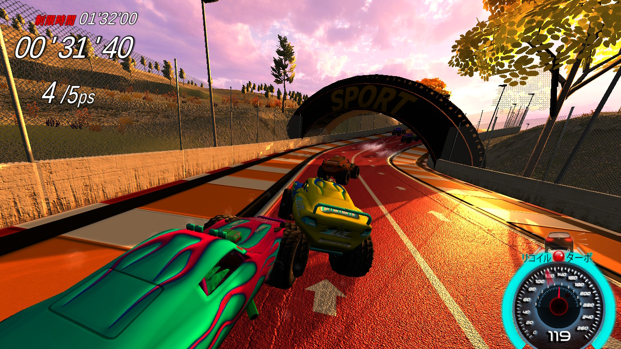 | 特徴 | 進化する走りで、常に最速を目指せ! ピンチをチャンスに変えて、ライバルを蹴散らそう! バーン! スーパートラックスはモンスタートラックを使用したレースゲームです。 アメリカ全土を北から南へ、海岸沿いや山岳地帯といったコースで激しいレースを繰り広げます。 激しいレースには危険が付き物! 急カーブや車同士の激しい衝突で思わぬトラブルに巻き込まれますが、プレイヤーのテクニックで回避するのも限度があります、、、。 でも本作では、そんな心配は必要ありません! なぜなら、クラッシュ直前に 時間を巻き戻すオプション≪フラッシュバック≫ で、ピンチが新しいチャンスに変わります! 攻めのライン取りでライバルを蹴散らして、ゴールを目指しましょう! 本作では3つのプレイモードで遊べます。 ・チャンピオンシップ 全6コースを順番にレースし、各コース内での通算成績1位を目指します。 ・トレーニング トレーニング用のオーバルコースで、基本的な操作を練習を行います。 ・タイムトライアル 各コースの最速クリアを目指します。 最速クリアのラップはオンラインラインキングに登録されます。 世界中のユーザーと最速タイムを競い、世界No1を目指しましょう。 目がくらむようなジャンプや、思いがけないスリップ、ライバルからのアタックなど、エキサイティングなレースが体験できます。 しかし、忘れないでください!最速のあなた自身が最大最悪のライバルになることを、、、。 価格 :800円(税込)